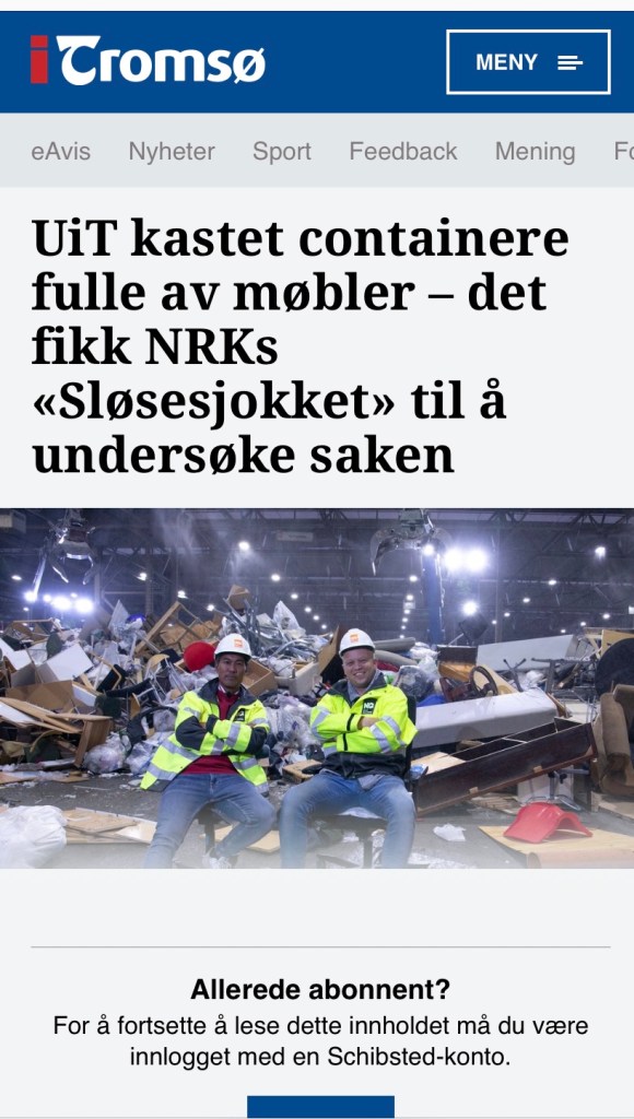 Ukategorisert ITromsø.no: UiT kastet containere fulle av møbler – det fikk NRKs «Sløsesjokket» til å undersøke saken Skrevet av strandchristian den 24. januar 202124. januar 2021 Les hele saken Her Del dette: Klikk for å dele på X(åpnes i en ny fane) X Klikk for å dele på Facebook(åpnes i en ny fane) Facebook Lik Laster inn...